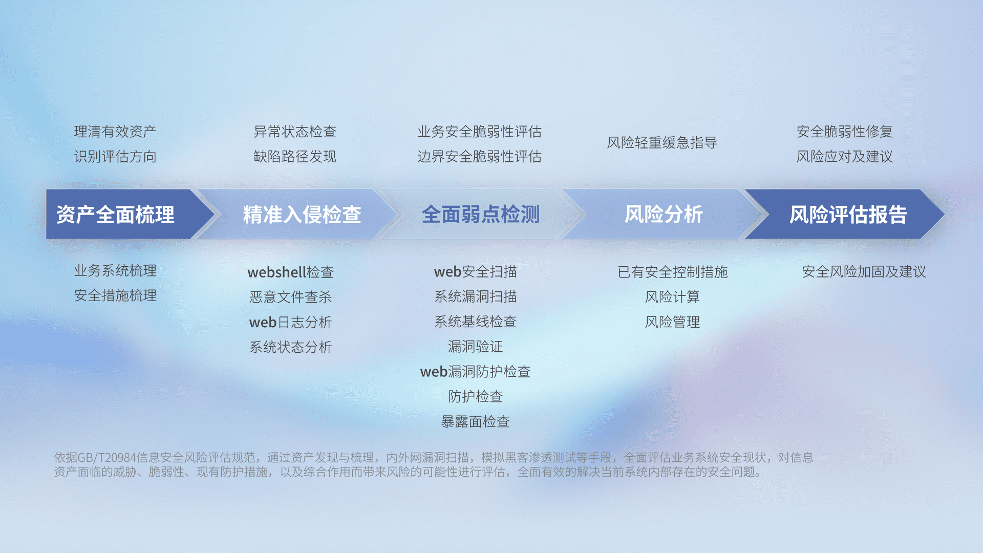针对客户行业特性,,,以专业的安全服务+多厂商联合解决方案提供专属的一站式安全管理服务,,帮助客户全面感知网络空间威胁,,,,基于识别、、、、检测、、、、分析、、、、防护、、、监测、、、响应的服务理论模型,,,,从方案咨询、、集成交付、、评估验证、、优化加固、、运维运营,,致力于为客户提供完整的闭环管理式安全服务。。。以实战经验为客户打造高抵御风险的安全体系,,帮助客户发现威胁、、、、对抗威胁、、、、处置威胁,,不断积累安全对抗能力,,,持续保障数字化安全。。